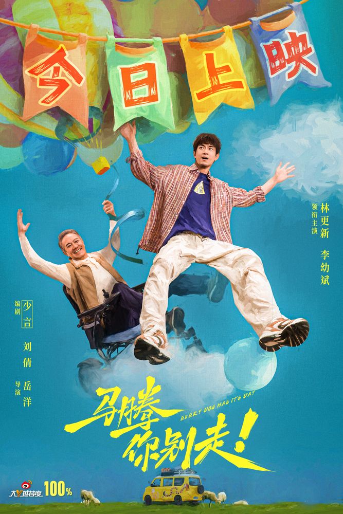 湛蓝晴空下,马腾与老林挣脱现实的地心引力,悠然漂浮于云端。身坐轮椅的老林,挣脱了病痛与衰老的禁锢,面带笑意张开双臂拥抱蓝天;马腾则一脸轻快,仿佛卸下了现实里所有沉重包袱。两张海报以轻盈灵动的笔触传递出温暖期许:走进影院,给疲惫的心灵好好松个绑。